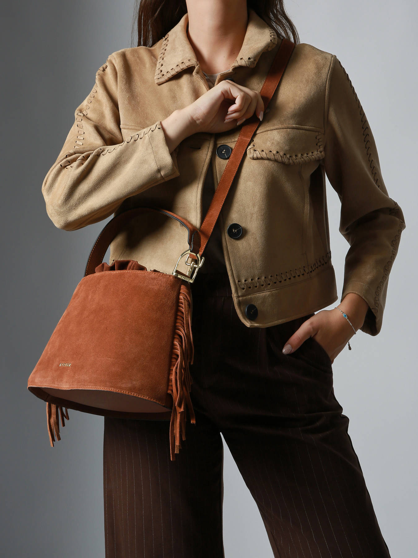 The ETRIER crossbody bag from the COUNTRY line is a bucket bag crafted from velvety leather with an original trapeze shape. It closes with a fabric pouch featuring a drawstring. This pouch is secured to the bottom of the bag with a snap for added stability. It can be carried by hand using its handle or worn crossbody thanks to its shoulder strap. The fringes adorning the sides add a touch of movement and freedom to this model. The back of the bag, made of smooth leather, provides better structure. A stirrup-shaped charm embellishes the side of the handle, adding a refined signature to the overall design. COUNTRY captures the essence of a free and elegant style, blending authentic textures with natural flow, perfect for a winter look.